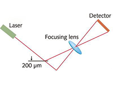 在激光三角檢測技術(shù)中,用一精細聚焦的激光束來掃描圓片表面,光學(xué)系統(tǒng)將反射的激光聚焦到探測器(圖1)。采用3D激光三角檢測術(shù)來檢測微凸點的形貌時,在精度、速度和可檢測性等方面它具有明顯的優(yōu)勢。這一檢測技術(shù)目前所面臨的挑戰(zhàn)包括有凸點的尺寸和凸點之間的間隔都很小,以及在整個圓片上布滿有數(shù)百萬個凸點。