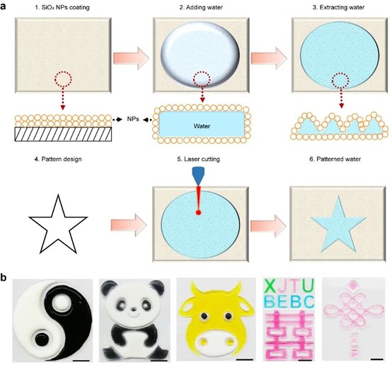 “抽刀斷水水更流”!針對(duì)水如何能實(shí)現(xiàn)切割這一難題,西安交通大學(xué)生命科學(xué)與技術(shù)學(xué)院仿生工程與生物力學(xué)研究所合作提出“激光切水”的新技術(shù)。首先,用疏水性的SiO2納米顆粒包覆在水的表面構(gòu)建了厚度為亞毫米級(jí)的水餅,隨后用激光對(duì)該水餅實(shí)施切割,成功實(shí)現(xiàn)了“激光切水”的構(gòu)想,并制造出了多種“水圖案”。