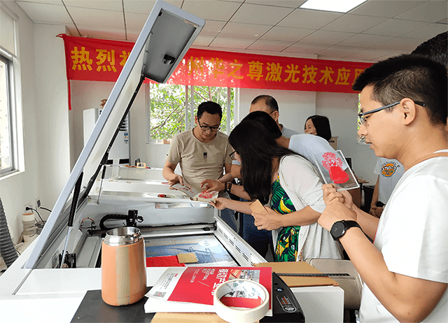 學(xué)院老師參觀設(shè)備中,對設(shè)備有著濃厚的興趣;老師手中拿著的樣品都是由現(xiàn)場的激光設(shè)備制造而成.
