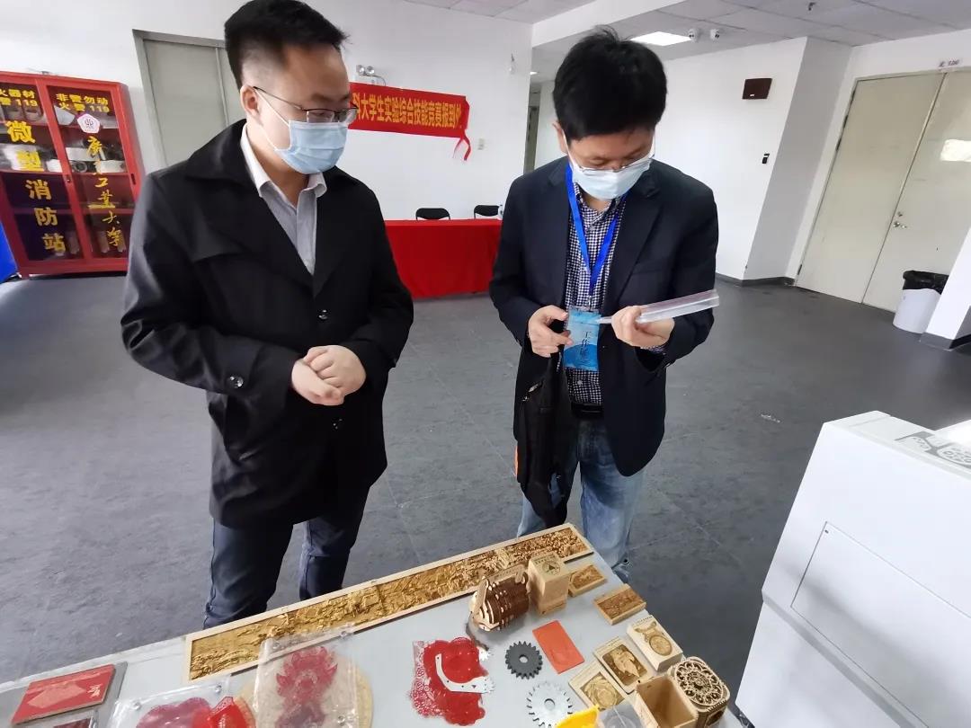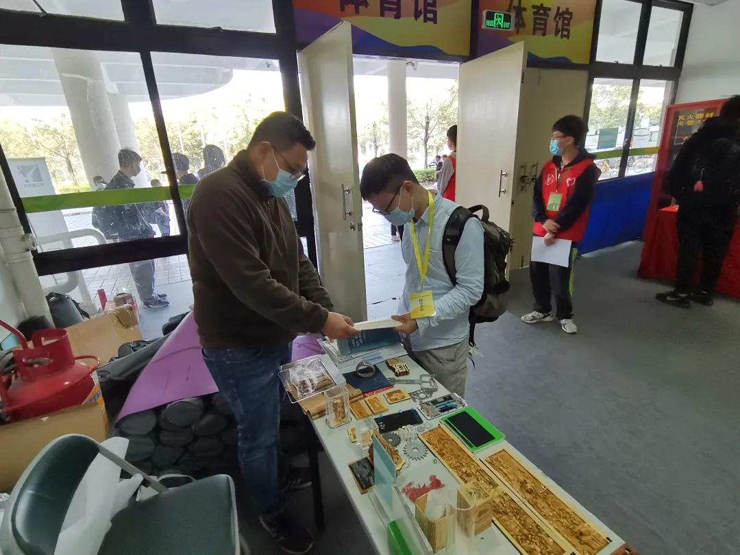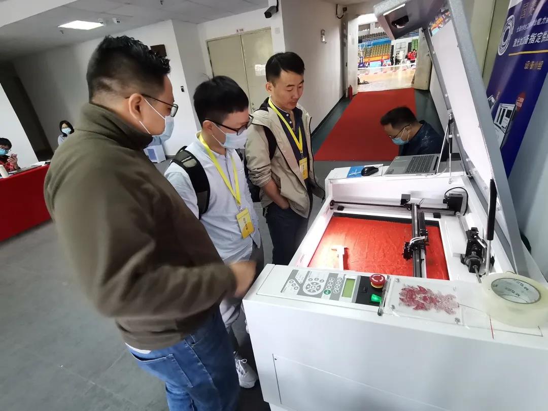 向參觀者演示機器切割剪紙。華之尊激光設(shè)備光斑極細,激光與卡紙的接觸面積極小,從而在切割過程中不會產(chǎn)生發(fā)黑、發(fā)黃、起火及碳化等效果,切割R弧可達0.2mm,切縫小于0.03mm,能將平面圖案通過華之尊激光精確切割出來。