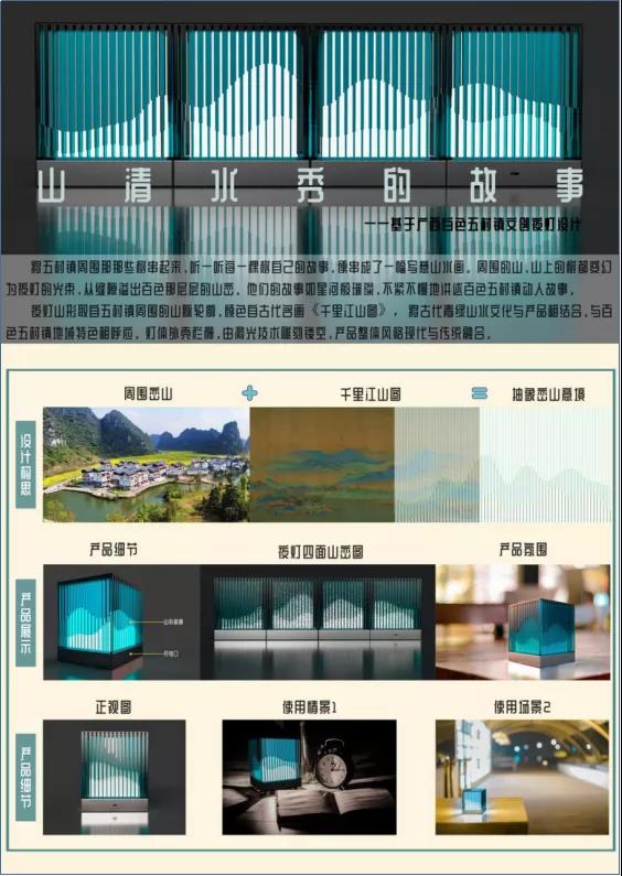 產(chǎn)品介紹:夜燈山形取自五村鎮(zhèn)周圍的山脈輪廓,顏色取自古代名畫《千里江山圖》,將古代青山綠水文化與產(chǎn)品相結(jié)合,與百色五村鎮(zhèn)地域特色相呼應(yīng)。燈體外殼欄柵,有激光技術(shù)雕刻鏤空,產(chǎn)品整體風(fēng)格現(xiàn)代與傳統(tǒng)融合。
