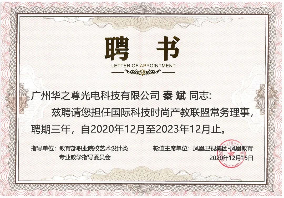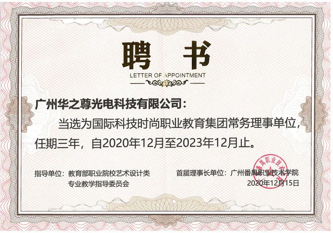 教育向善,共生未來(lái)!世界因你而溫暖!廣州華之尊光電科技有限公司榮獲國(guó)際科技時(shí)尚職業(yè)教育集團(tuán)常務(wù)理事單位。華之尊激光秦斌總經(jīng)理榮獲“雙高”建設(shè)項(xiàng)目——廣州番禺職業(yè)技術(shù)學(xué)院設(shè)計(jì)專業(yè)群建設(shè)指導(dǎo)委員會(huì)委員、國(guó)際科技時(shí)尚產(chǎn)教聯(lián)盟商務(wù)理事。