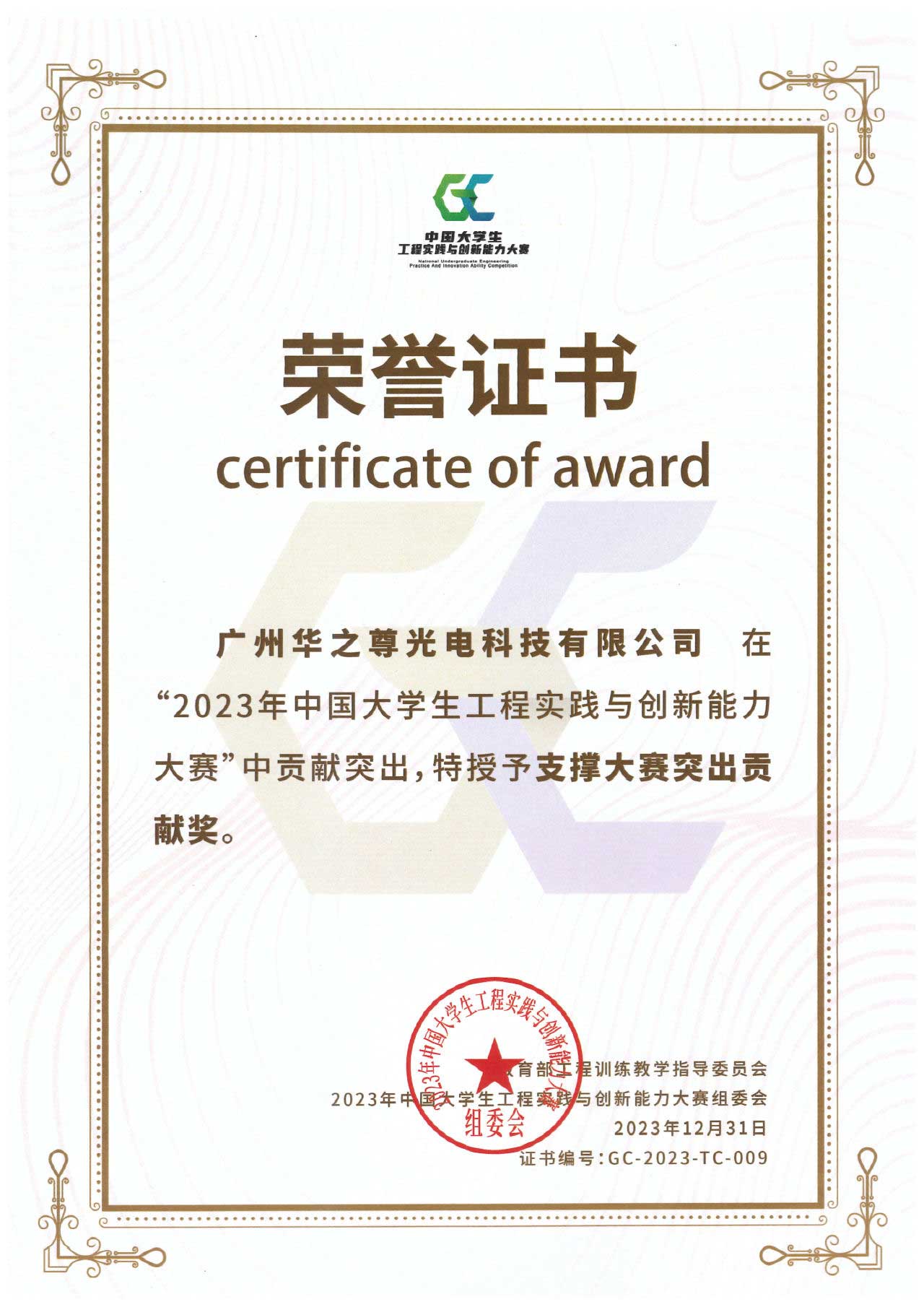 廣州華之尊光電科技有限公司榮獲2023年中國大學生工程實踐與創(chuàng)新能力大賽突出貢獻獎!