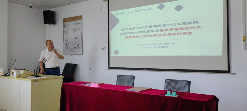 簽約儀式后,華之尊激光秦斌總經(jīng)理以《培育新質(zhì)生產(chǎn)力重構(gòu)數(shù)智時代工程實(shí)踐拔尖創(chuàng)新人才培養(yǎng)體系暨高精密激光技術(shù)在數(shù)智時代的創(chuàng)新應(yīng)用與前沿探索》為主題做了學(xué)術(shù)報告。報告深入剖析了激光技術(shù)在智能制造領(lǐng)域的核心價值與發(fā)展趨勢,強(qiáng)調(diào)校企協(xié)同在培養(yǎng)適應(yīng)“數(shù)智時代”需求的高素質(zhì)工程人才中的關(guān)鍵作用。他詳細(xì)闡述了如何將企業(yè)前沿技術(shù)、真實(shí)案例融入教學(xué)實(shí)踐,構(gòu)建以激光加工技術(shù)為紐帶的多學(xué)科融合課程體系,為現(xiàn)場師生描繪了一幅激光技術(shù)賦能教育創(chuàng)新的宏偉藍(lán)圖。